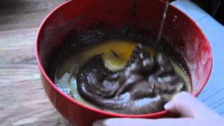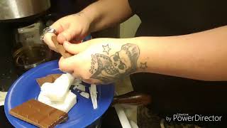 Smält allt i en tallrik över vattenbad. Life of Riley av Kevin. Kladdkakan toppas med Bounty.